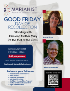 All are welcome to attend our annual Good Friday Day of Recollection on Friday, April 3, 2026, at the beautiful and peaceful Marianist Retreat and Conference Center. The theme of the day is “Standing with John and Mother Mary (at the foot of the cross)” and it doesn’t get much more Marianist than that! The world-famous Marianist Three O’clock prayer (https://www.marianist.com/three-oclock-prayer/) begins with this line: